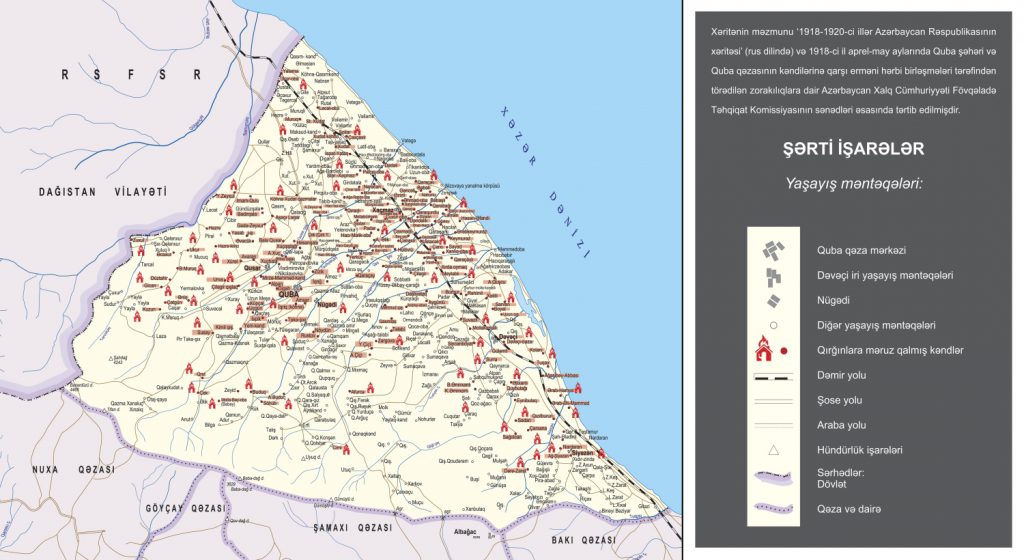 Bölmədə Azərbaycan Xalq Cümhuriyyəti dövründə tərtib edilmiş Quba qəzasının xəritəsidə nümayiş olunur. Məlumat bölməsi təşkil edilərkən həmin xəritədə 1918-ci ildə soyqırımlarına məruz qalmış kəndlər xüsusi qırmızı nişanlarla işarələnmişdir. İlkin məlumatlara görə, qəzada 122 kəndin talanlara və dağıntılara məruz qalması qeyd olunsa da, daha dəqiq aparılmış təhqiqatlar nəticəsində bu kəndlərin sayı 167 olduğu sübut olunmuşdur. Quba şəhəri və ətraf kəndlərində-38, Qusarda-27, Xaçmazda-65, Şabranda-21, Siyəzəndə-16 yaşayış məntəqəsi dağıdılmışdır.
