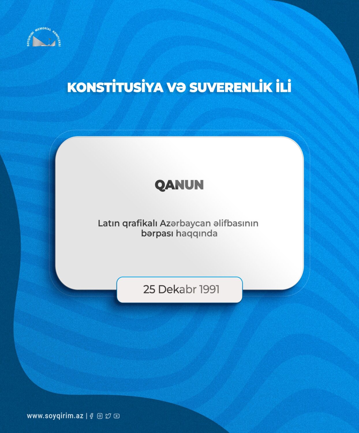 Latın qrafikalı Azərbaycan əlifbasının bərpası haqqında Azərbaycan Respublikasının Qanunu (25 dekabr 1991) Geniş müzakirə və elmi diskussiyaların nəticəsi olaraq, 1926-cı ildə Bakı şəhərində keçirilən I Ümumittifaq Türkoloji qurultayın tövsiyəsi ilə Azərbaycan xalqı türk xalqları ilə birlikdə latın qrafikalı əlifbanı qəbul etmişdi. Azərbaycan dilinin səs quruluşu ilə uzlaşıb orfoqrafiya qaydalarının sadələşməsinə imkan açan, qısa müddətdə kütləvi savadlanmaya səbəb olan və xalqlar arasında elmi, mədəni əlaqələri genişləşdirən Azərbaycan əlifbası xalqın iradəsinə zidd olaraq, Mərkəzin təzyiqi ilə 1939-cu ildə kiril əlifbası ilə əvəz olunmuşdu. Bu akt 30-cu illərin kütləvi respressiyasının məntiqi davamı olub, türk xalqlarının milli özünüdərk prosesinin qarşısını almaq, onları tədricən yadlaşdırıb bir-birindən uzaqlaşdırmaq məqsədi güdürdü. Azərbaycan Respublikası Ali Sovetinin Milli Şurası yol verilmiş tarixi ədalətsizliyi aradan qaldırmaq üçün qərara alır: 1. «Azərbaycan əlifbasının latından rus əlifbasına keçirilməsi haqqında» 11 iyul 1939-cu il tarixli Azərbaycan SSR-in Qanunu bu gündən qüvvədən düşmüş hesab edilsin. 2. 1940-cı ilə qədər Azərbaycanda istifadə edilən 32 hərfdən ibarət latın qrafikalı Azərbaycan əlifbası kiçik dəyişikliklərlə bərpa olunsun. Azərbaycan Respublikasının Prezidenti Bakı şəhəri, 25 dekabr 1991-ci il № 33
