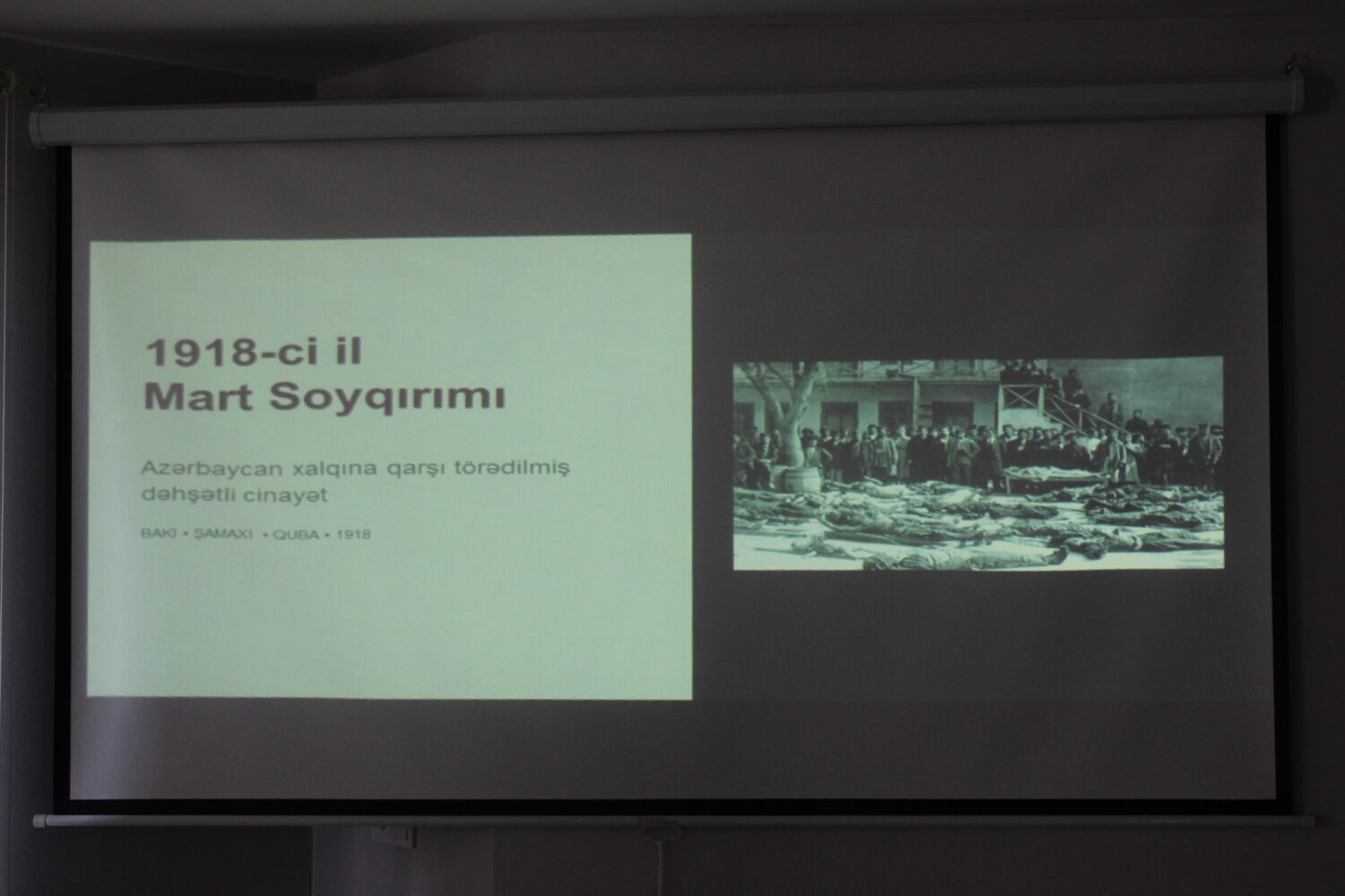Tədbir çərçivəsində memorial kompleksin əməkdaşı Nurcan Allahverdiyeva tərəfindən 1918-ci il soyqırımı Bakı şəhəri və Bakı kəndlərinin sakinlərinin şahid ifadələrində (Fövqəladə Təhqiqat Komissiyasının sənədləri əsasında) mövzusunda təqdimat keçirilib. Təqdimatda arxiv materialları, elmi araşdırmalar və müxtəlif mənbələr əsasında 1918-ci ildə baş vermiş hadisələrin tarixi konteksti barədə iştirakçılara ətraflı məlumat verilib.